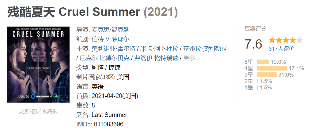 Freeform预订Bert V. Royal执笔﹑Max Winkler执导的惊悚剧试映集《残酷夏天 Cruel Summer》,这部非常规剧项目讲述93-95年得州小镇里的两个女主角,第一个是Kate,在剧中被绑架,另一是Jeanette,甜美﹑不擅社交的她成为了镇上 最受欢迎的人,但于95年时成为全美最被鄙视的人。剧集每集都以这两女主的视角描述剧情,然后慢慢披露事情的真相。