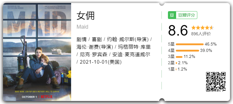 女佣 2021-10-08 4,618 未标题-3 百度网盘会员,楼主提供官方渠道年费197再返现10元,新用户可返20元 网盘续费或者链接失效,可联系楼主微信LZHR000 (由于主力百度网盘被封,以往大部分百度的链接大概率失效) 如果链接失效,可联系楼主微信LZHR000 百度云 链接:https://pan.baidu.com/s/14WzVqGbxjwmZET5uvLyheQ提取码:dpdp 《女佣浮生录》改编自斯蒂芬妮·兰德的《纽约时报》畅销回忆录《Maid: Hard Work, Low Pay, and a Mother’s Will to Survive》,以单亲妈妈亚历克斯为主角展开叙述,她靠当女佣来艰难地维持生计,同时努力摆脱受虐关系和流离失所的状态,以便为女儿麦蒂创造更好的生活。该剧集通过这名绝望但坚定的女性感性而幽默的视角,如实展现了一名母亲的韧性。